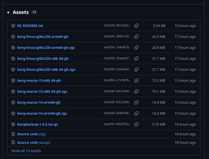 - I went to https://github.com/borgbackup/borg/releases, where I found version 1.4.2 as the latest stable version at this point in time, and a list with associated assets like this: